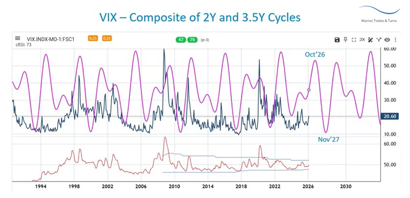 The next significant cycle peak and trough are estimated to occur in November of 2026 and throughout 2027, respectively. Following that inflection point, the VIX will generally maintain an upside bias toward 2032. Given that stock market movements are typically inversely correlated with those of the VIX, does this imply that the equity market will decline through October 2026, rally in 2027, and subsequently enter a secular bear market until the early 2030s?