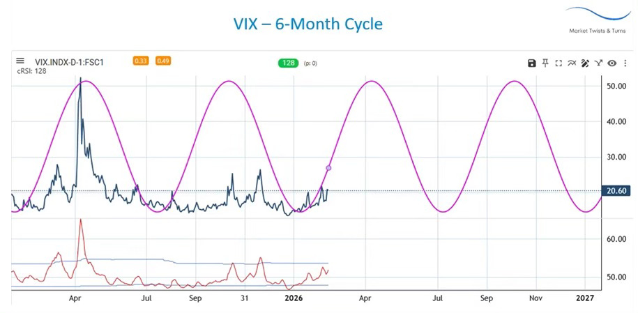 Seasonality within the Standard & Poor’s 500 Volatility Index (VIX) indicates that volatility typically rises toward the spring, declines during the summer months, and ascends once more in October. Chart 1 illustrates the six-month cycle that dominates the daily timeframe, aligning closely with established VIX seasonality patterns.